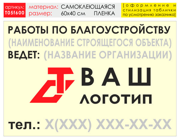 Баннер «Работы по благоустройству» (T05) может быть изготовен в различных размерах на самоклеящейся плёнке, ПВХ-пластике или баннерной ткани (а также на металле - под заказ) как по нашему, так и по Вашему макету или эскизу. В цену баннера включены: разработка и согласование макета, а также изготовление и упаковка. Изготавливаем таблички любых размеров и на любом материале (включая и металл) по Вашим макетам и эскизам