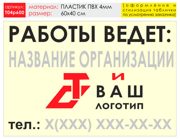 Баннер «Работы ведет», T04 (пластик 4 мм, 60х40 см) в Великом Новгороде купить