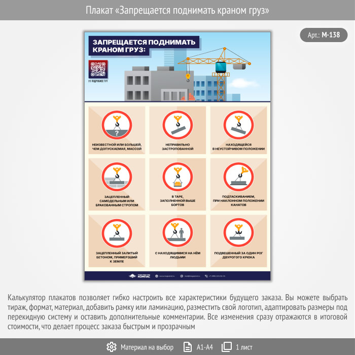 Плакат «Запрещается поднимать краном груз» с QR (М-138, 1 лист) в Великом Новгороде купить