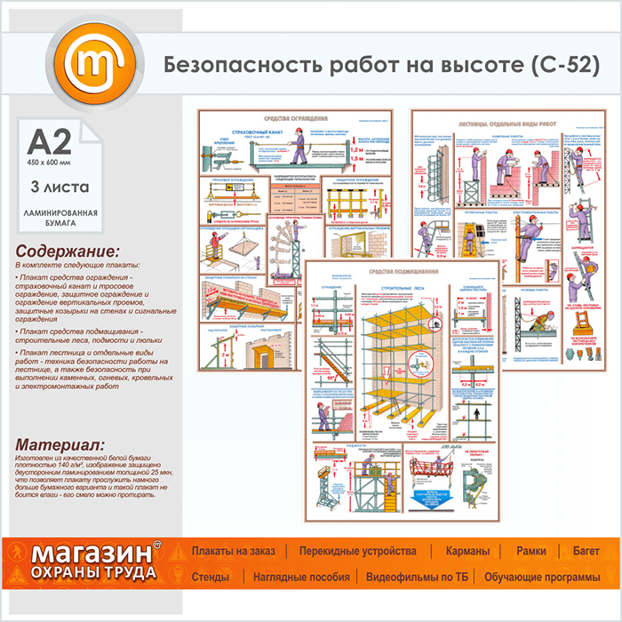 Плакаты «Безопасность работ на высоте» (С-52, ламинированная бумага, А2, 3 листа) в Великом Новгороде купить