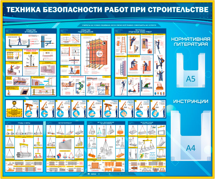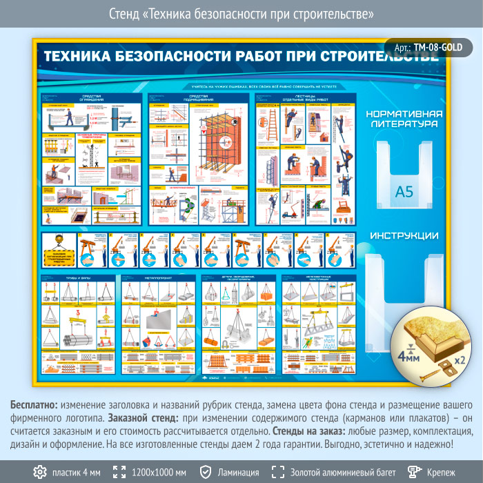 Стенд «Техника безопасности при строительстве» с 2 объемными карманами (TM-08-GOLD) в Великом Новгороде купить