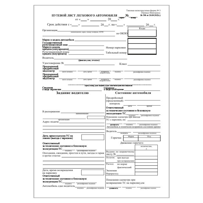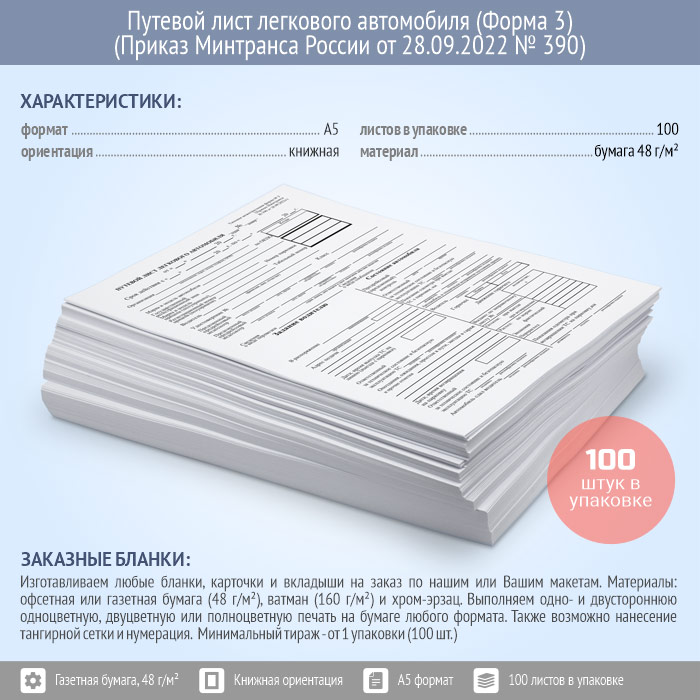 Путевой лист легкового автомобиля (Форма № 3) (Приказ Минтранса России от 28.09.2022 № 390) (упаковка из 100 штук) в Великом Новгороде купить