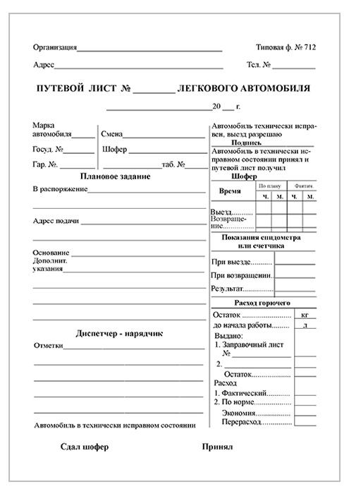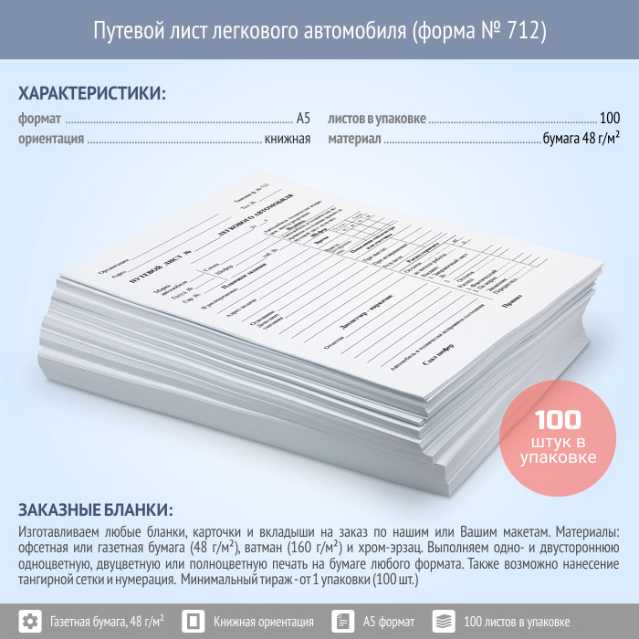 Путевой лист легкового автомобиля (форма № 712, упаковка из 100 штук) в Великом Новгороде купить