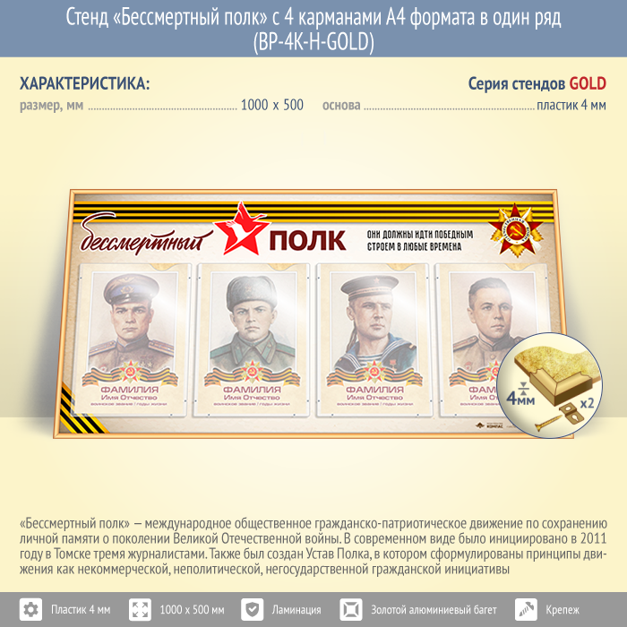 Стенд «Бессмертный полк» с 4 карманами А4 формата в один ряд (BP-4K-H-GOLD) в Великом Новгороде купить