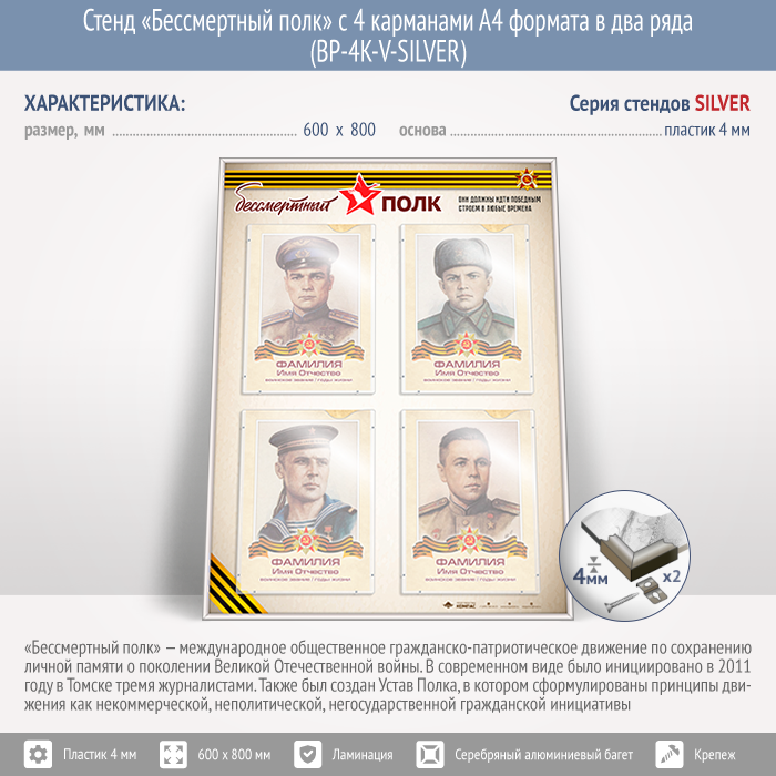 Стенд «Бессмертный полк» с 4 карманами А4 формата в два ряда (BP-4K-V-SILVER) в Великом Новгороде купить