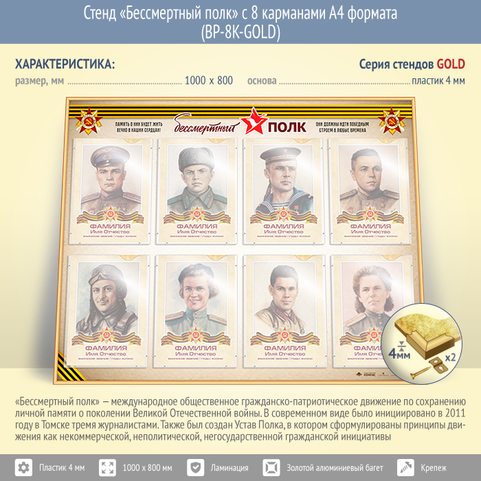 Стенд «Бессмертный полк» с 8 карманами А4 формата (BP-8K-GOLD) в Великом Новгороде купить