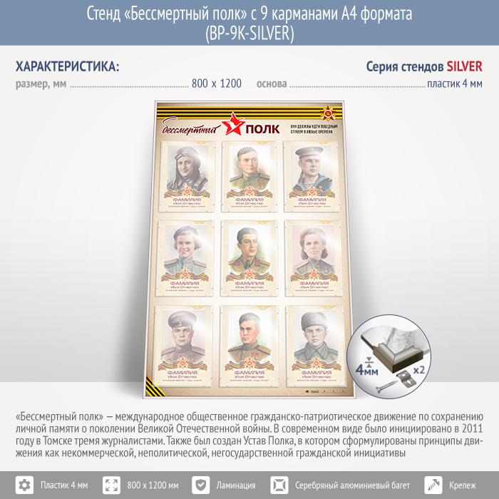 Стенд «Бессмертный полк» с 9 карманами А4 формата (BP-9K-SILVER) в Великом Новгороде купить