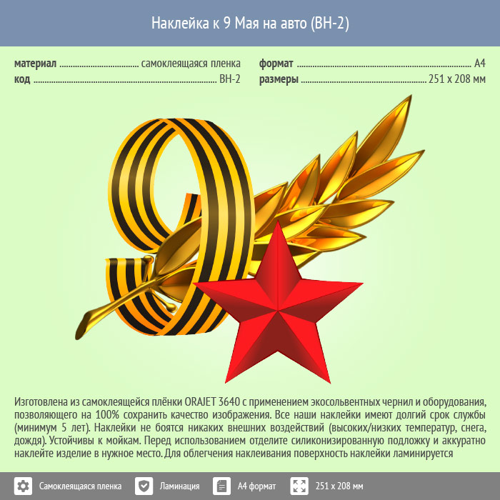 Наклейка к 9 Мая на авто А4 формата (BH-2) в Великом Новгороде купить