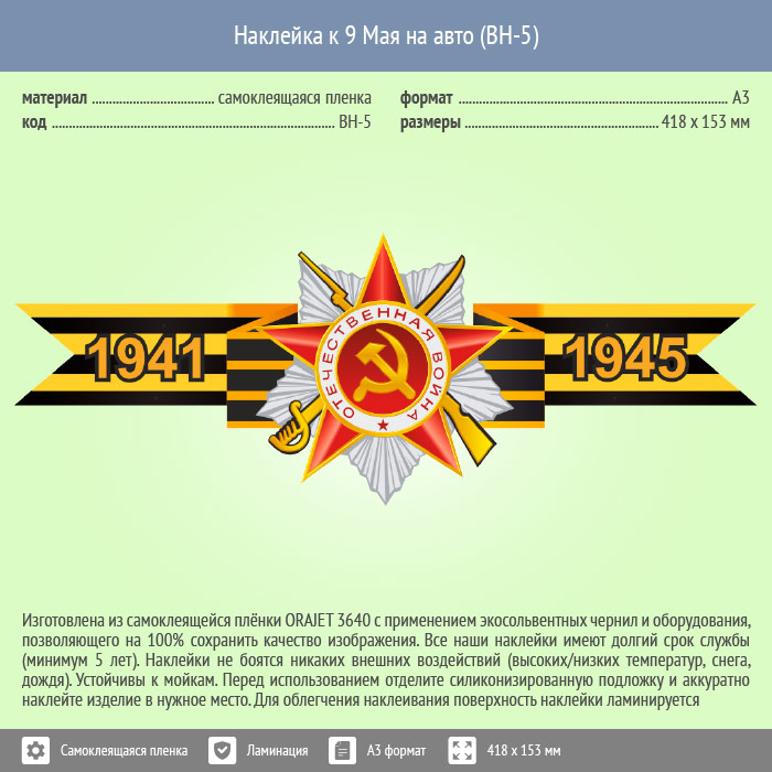 Наклейка к 9 Мая на авто А3 формата (BH-5) в Великом Новгороде купить