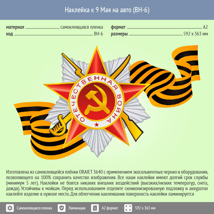 Наклейка к 9 Мая на авто А2 формата (BH-6) в Великом Новгороде купить