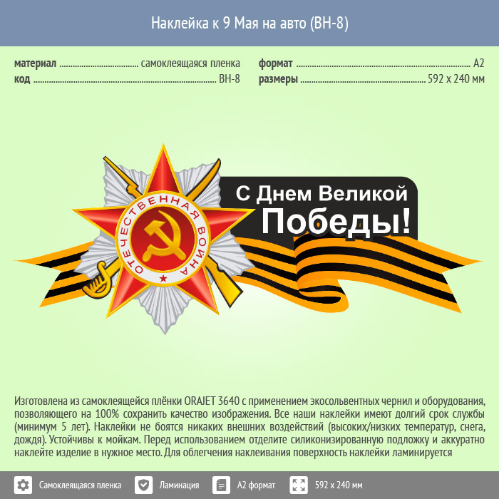 Наклейка к 9 Мая на авто А2 формата (BH-8) в Великом Новгороде купить