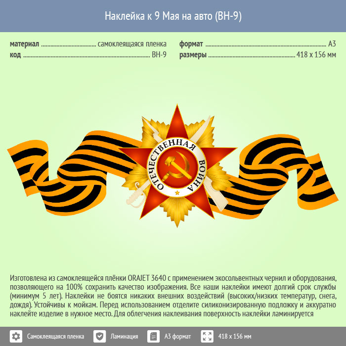 Наклейка к 9 Мая на авто А3 формата (BH-9) в Великом Новгороде купить