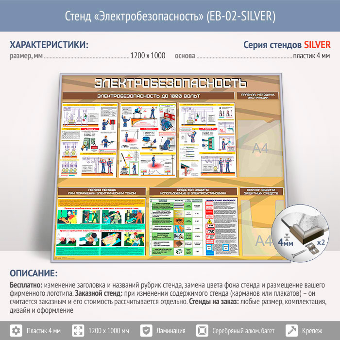Стенд «Электробезопасность до 1000 вольт» с плоским и объемным карманами (EB-02-SILVER) в Великом Новгороде купить