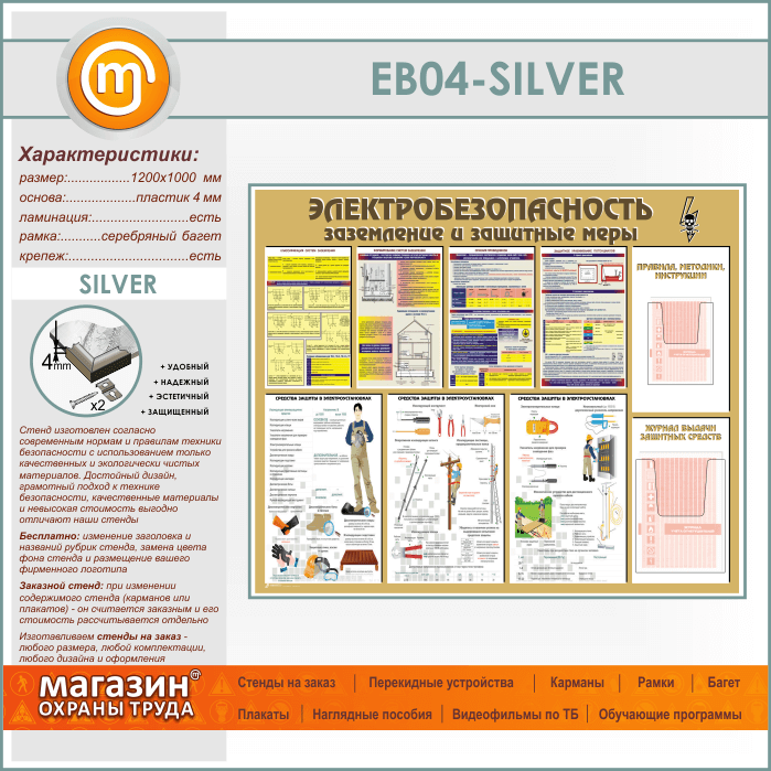 Стенд «Электробезопасность. Заземление и защитные меры» с 2 объемными карманами (EB-04-SILVER) в Великом Новгороде купить