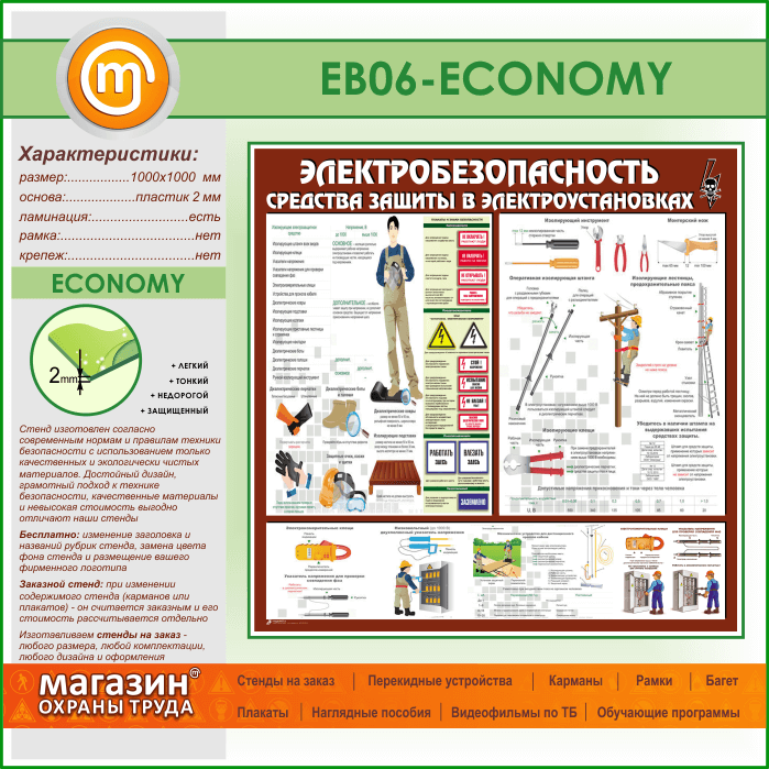 Стенд «Электробезопасность. Средства защиты в электроустановках» (EB-06-ECONOMY) в Великом Новгороде купить