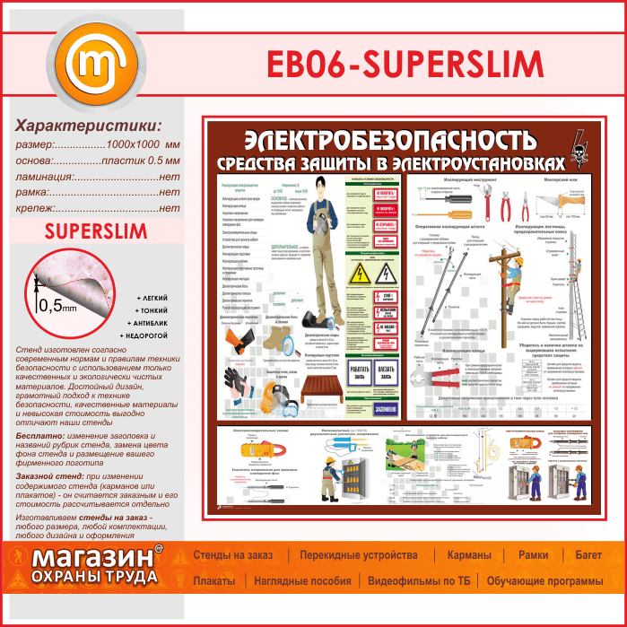 Стенд «Электробезопасность. Средства защиты в электроустановках» (EB-06-SUPERSLIM) в Великом Новгороде купить