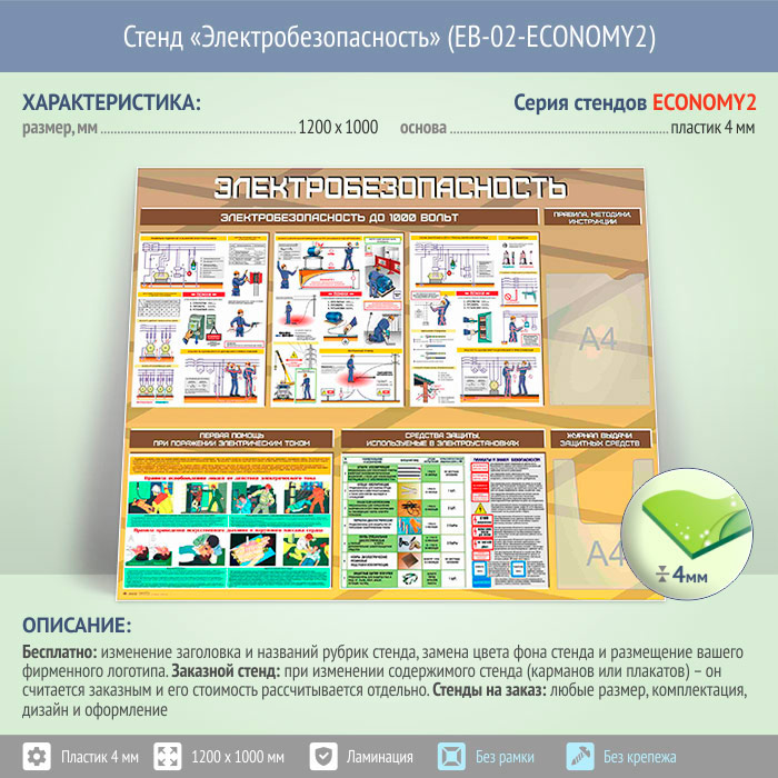 Стенд «Электробезопасность до 1000 вольт» с плоским и объемным карманами (EB-02-ECONOMY2) в Великом Новгороде купить