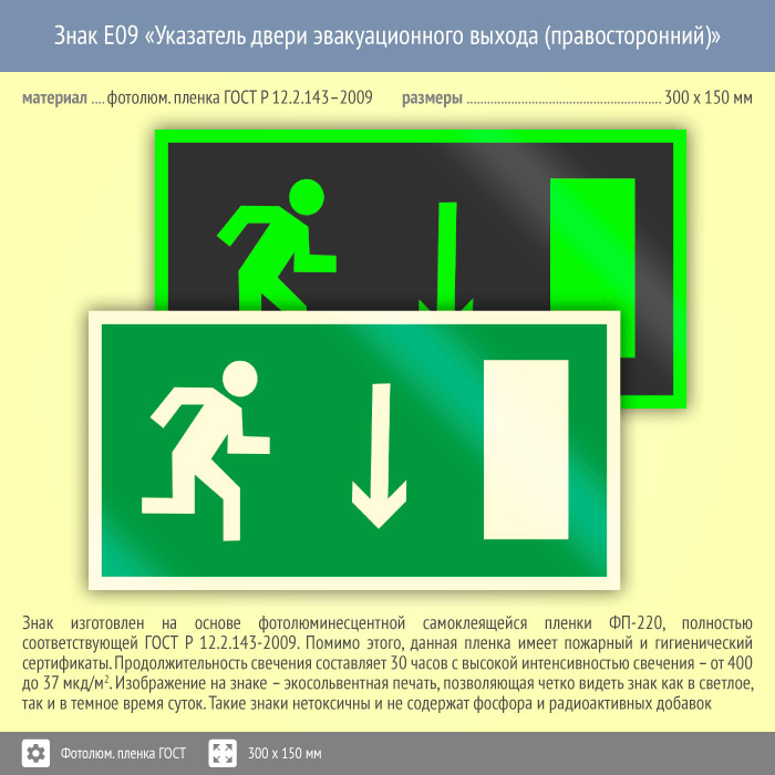 Знак E09 «Указатель двери эвакуационного выхода (правосторонний)» (фотолюминесцентная пленка ГОСТ 34428-2018, 300х150 мм) в Великом Новгороде купить