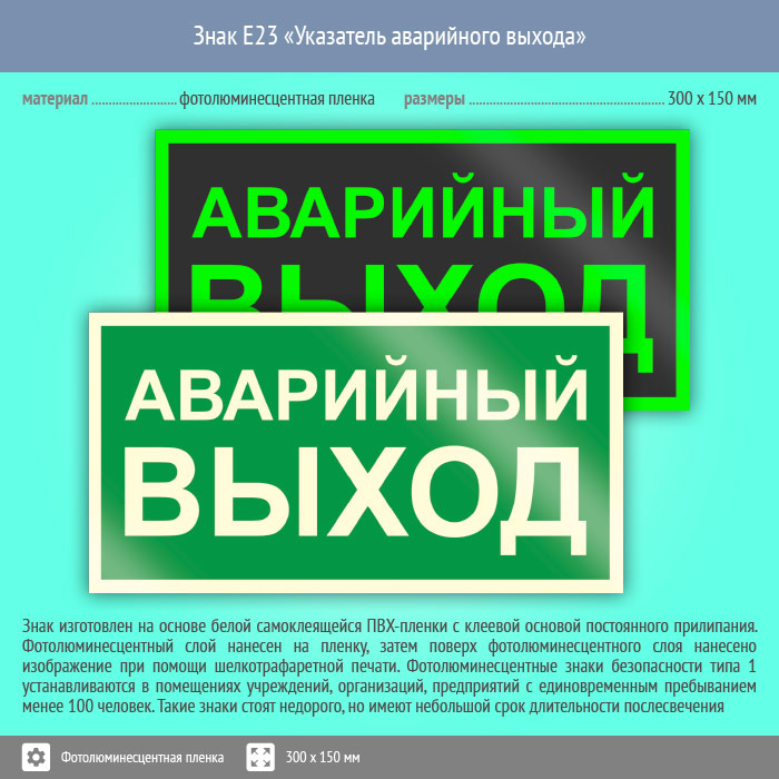 Знак E23 «Указатель аварийного выхода» (фотолюминесцентная пленка, 300х150 мм) в Великом Новгороде купить