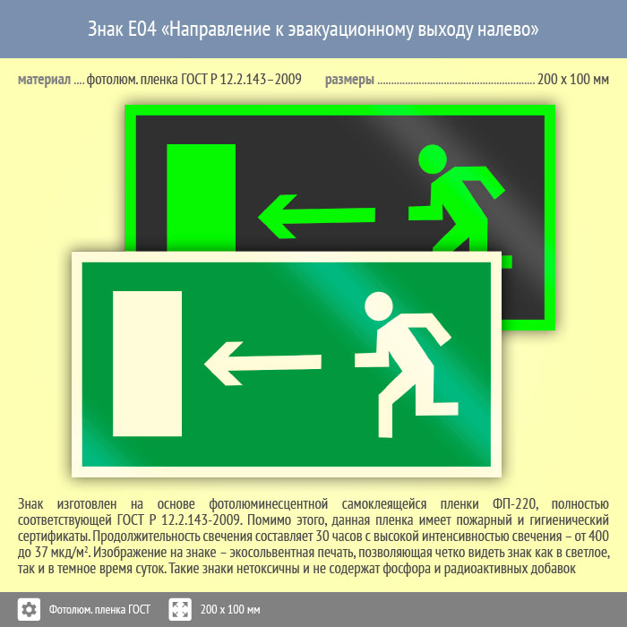 Знак E04 «Направление к эвакуационному выходу налево» (фотолюминесцентная пленка ГОСТ 34428-2018, 200х100 мм) в Великом Новгороде купить