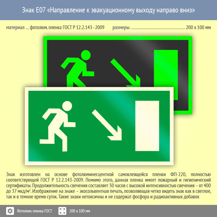 Знак E07 «Направление к эвакуационному выходу направо вниз» (фотолюминесцентная пленка ГОСТ 34428-2018, 200х100 мм) в Великом Новгороде купить