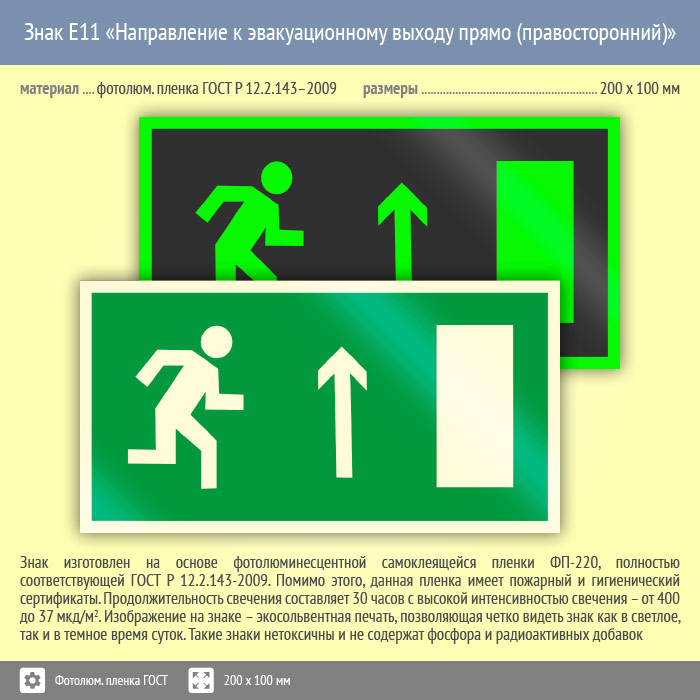 Знак E11 «Направление к эвакуационному выходу прямо (правосторонний)» (фотолюминесцентная пленка ГОСТ 34428-2018, 200х100 мм) в Великом Новгороде купить