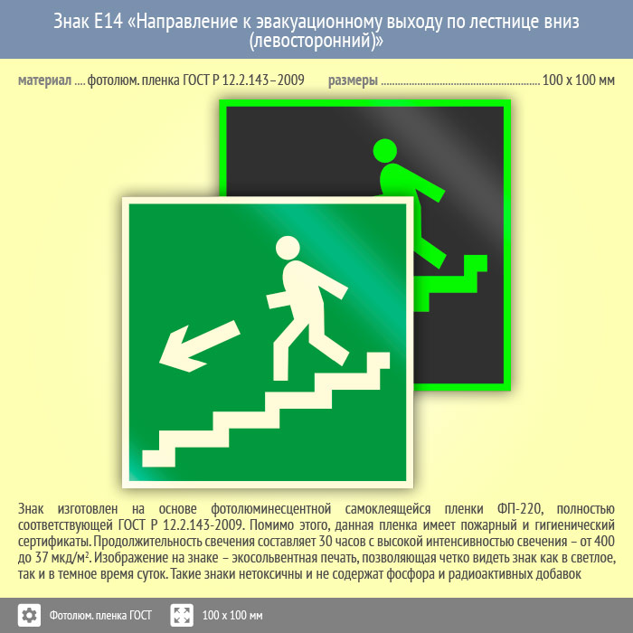Знак E14 «Направление к эвакуационному выходу по лестнице вниз (левосторонний)» (фотолюминесцентная пленка ГОСТ 34428-2018, 100х100 мм) в Великом Новгороде купить