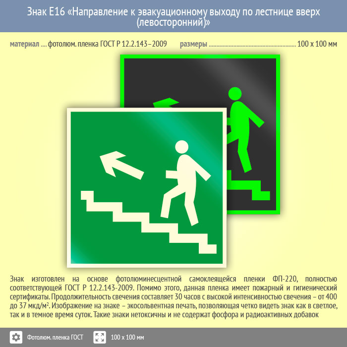 Знак E16 «Направление к эвакуационному выходу по лестнице вверх (левосторонний)» (фотолюминесцентная пленка ГОСТ 34428-2018, 100х100 мм) в Великом Новгороде купить