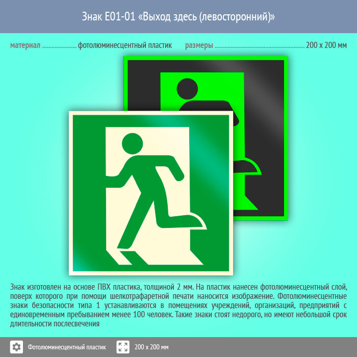 Знак E01-01 «Выход здесь (левосторонний)» (фотолюминесцентный пластик, 200х200 мм) в Великом Новгороде купить