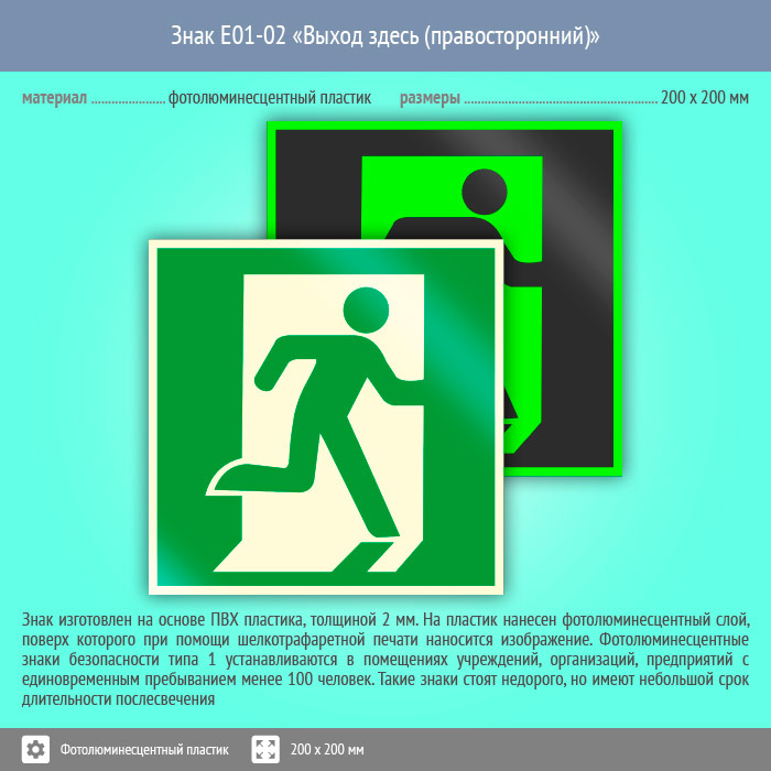 Знак E01-02 «Выход здесь (правосторонний)» (фотолюминесцентный пластик, 200х200 мм) в Великом Новгороде купить