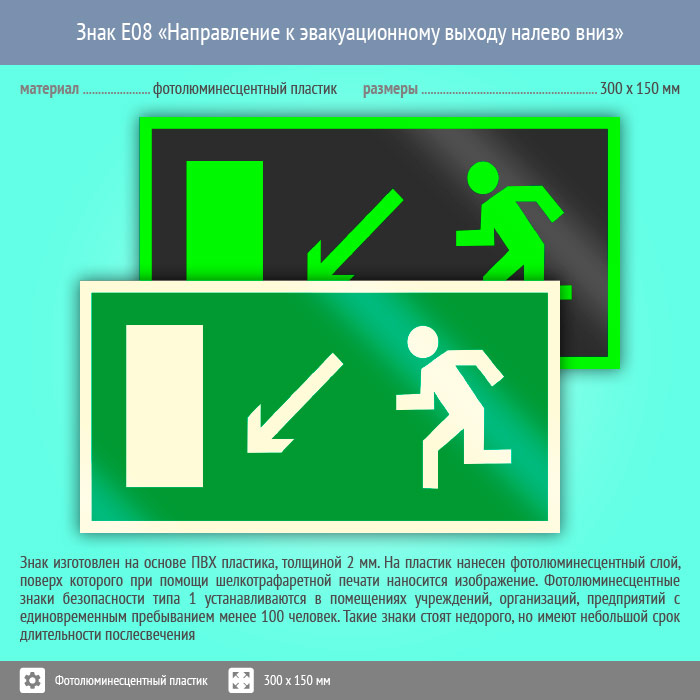Знак E08 «Направление к эвакуационному выходу налево вниз» (фотолюминесцентный пластик, 300х150 мм) в Великом Новгороде купить
