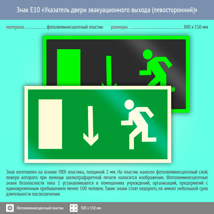 Знак E10 «Указатель двери эвакуационного выхода (левосторонний)» (фотолюминесцентный пластик, 300х150 мм) в Великом Новгороде купить