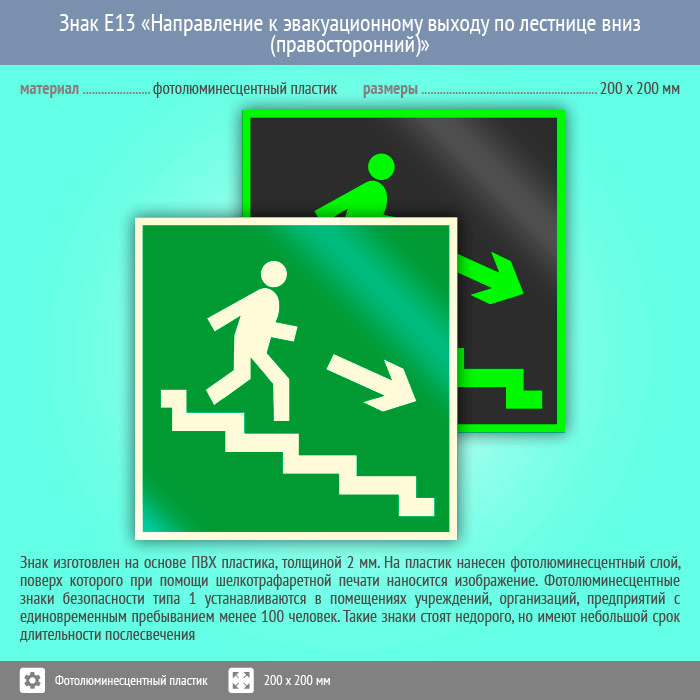 Знак E13 «Направление к эвакуационному выходу по лестнице вниз (правосторонний)» (фотолюминесцентный пластик, 200х200 мм) в Великом Новгороде купить