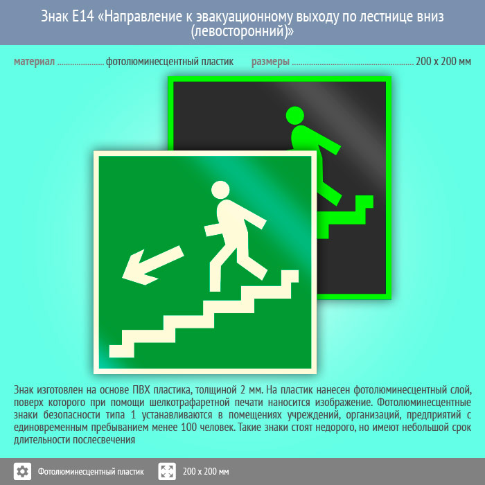 Знак E14 «Направление к эвакуационному выходу по лестнице вниз (левосторонний)» (фотолюминесцентный пластик, 200х200 мм) в Великом Новгороде купить