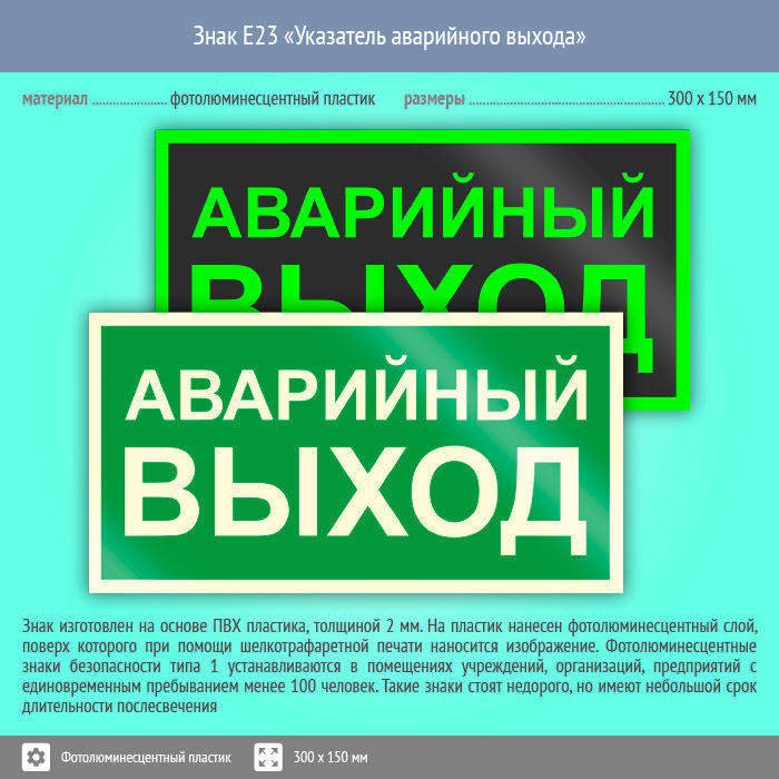 Знак E23 «Указатель аварийного выхода» (фотолюминесцентный пластик, 300х150 мм) в Великом Новгороде купить