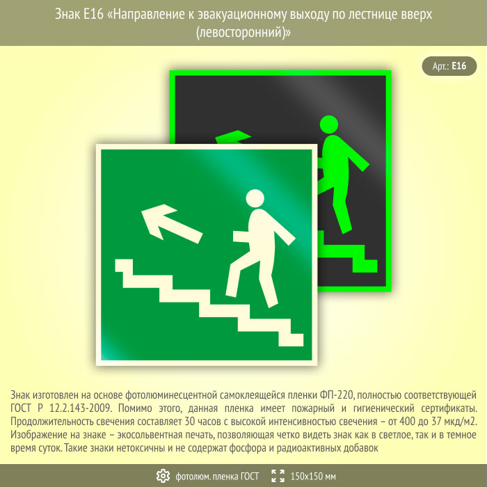Знак E16 «Направление к эвакуационному выходу по лестнице вверх (левосторонний)» (фотолюминесцентная пленка ГОСТ 34428-2018, 150х150 мм) в Великом Новгороде купить