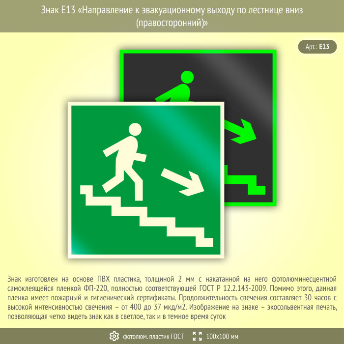 Знак E13 «Направление к эвакуационному выходу по лестнице вниз (правосторонний)» (фотолюминесцентный пластик ГОСТ 34428-2018, 100х100 мм) в Великом Новгороде купить