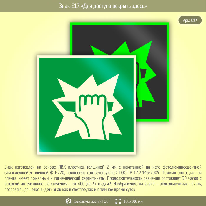 Знак E17 «Для доступа вскрыть здесь» (фотолюминесцентный пластик ГОСТ 34428-2018, 100х100 мм) в Великом Новгороде купить