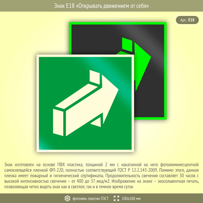 Знак E18 «Открывать движением от себя» (фотолюминесцентный пластик ГОСТ 34428-2018, 100х100 мм) в Великом Новгороде купить