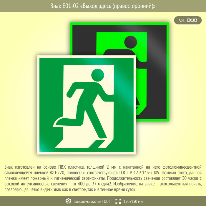 Знак E01-02 «Выход здесь (правосторонний)» (фотолюминесцентный пластик ГОСТ 34428-2018, 150х150 мм) в Великом Новгороде купить