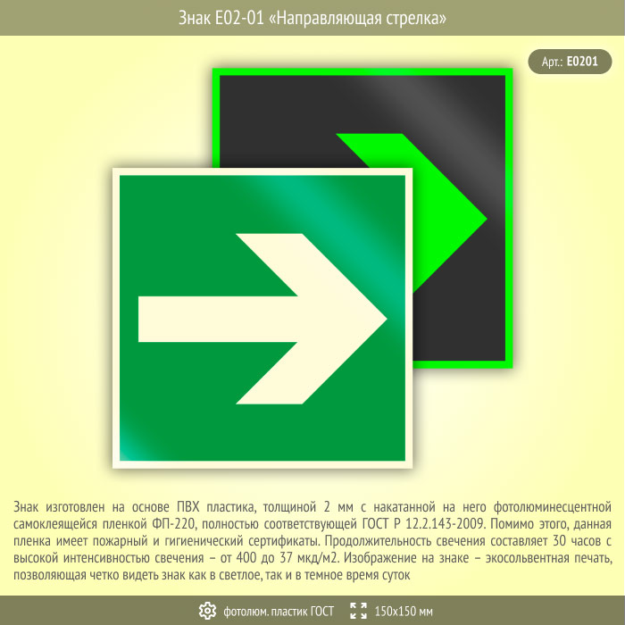 Знак E02-01 «Направляющая стрелка» (фотолюминесцентный пластик ГОСТ 34428-2018, 150х150 мм) в Великом Новгороде купить
