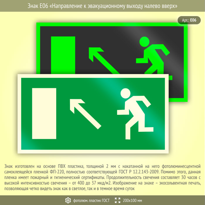Знак E06 «Направление к эвакуационному выходу налево вверх» (фотолюминесцентный пластик ГОСТ 34428-2018, 200х100 мм) в Великом Новгороде купить