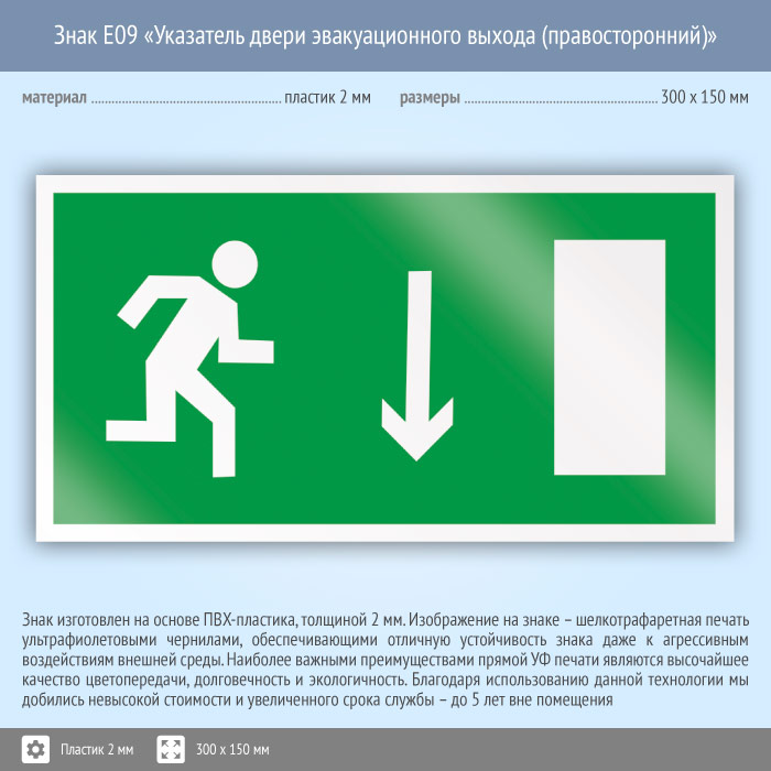 Знак E09 «Указатель двери эвакуационного выхода (правосторонний)» (пластик, 300х150 мм) в Великом Новгороде купить