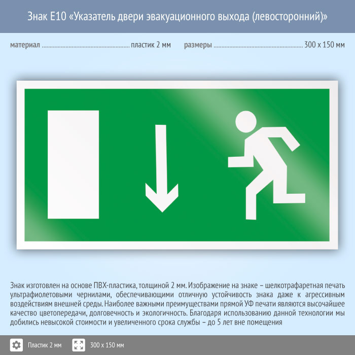 Знак E10 «Указатель двери эвакуационного выхода (левосторонний)» (пластик, 300х150 мм) в Великом Новгороде купить