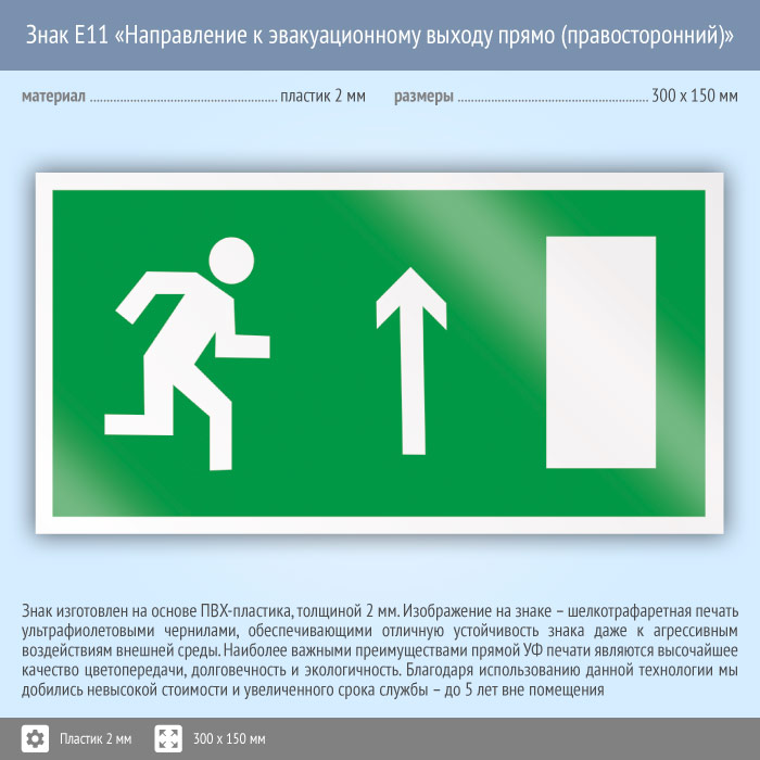 Знак E11 «Направление к эвакуационному выходу прямо (правосторонний)» (пластик, 300х150 мм) в Великом Новгороде купить
