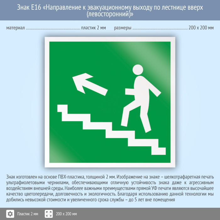 Знак E16 «Направление к эвакуационному выходу по лестнице вверх (левосторонний)» (пластик, 200х200 мм) в Великом Новгороде купить