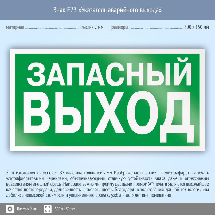 Знак E23 «Указатель запасного выхода» (устаревший) (пластик, 300х150 мм) в Великом Новгороде купить