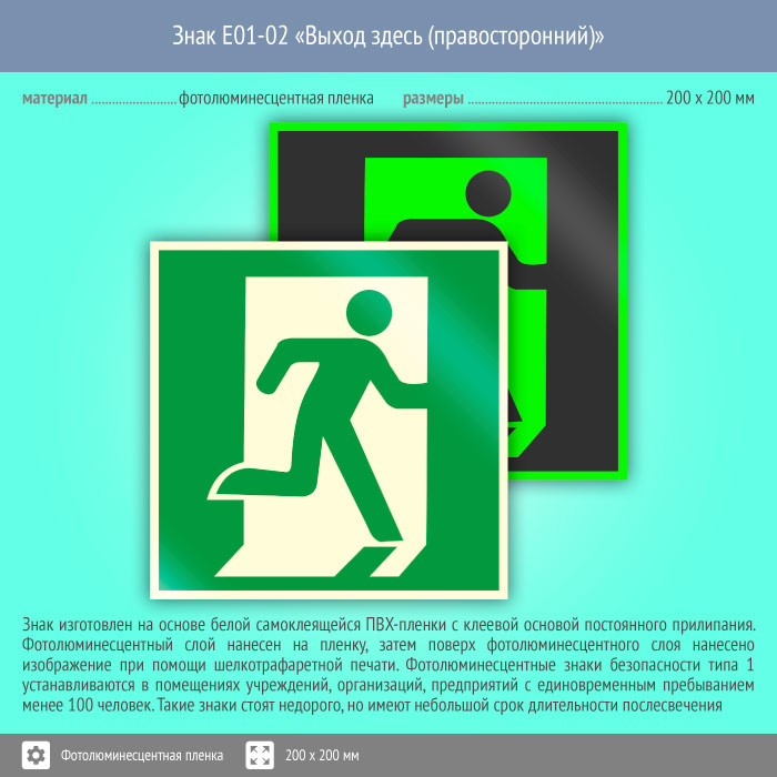 Знак E01-02 «Выход здесь (правосторонний)» (фотолюминесцентная пленка, 200х200 мм) в Великом Новгороде купить