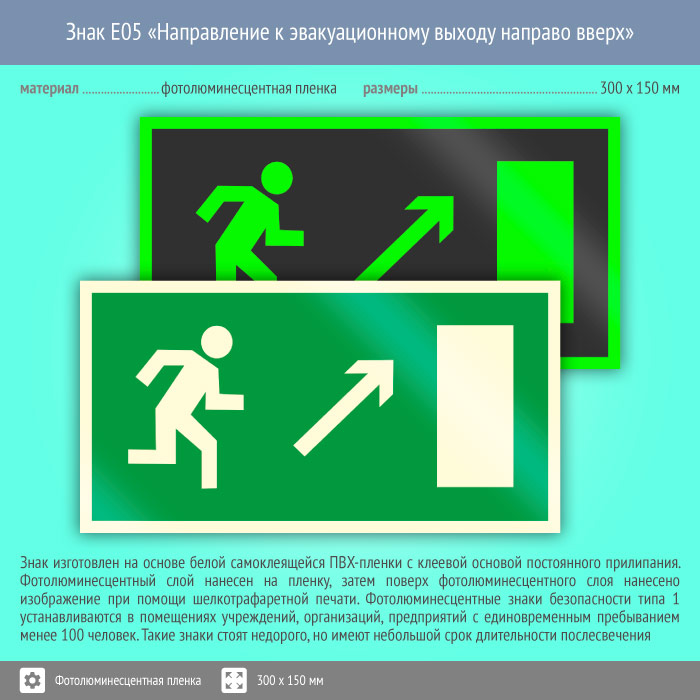 Знак E05 «Направление к эвакуационному выходу направо вверх» (фотолюминесцентная пленка, 300х150 мм) в Великом Новгороде купить