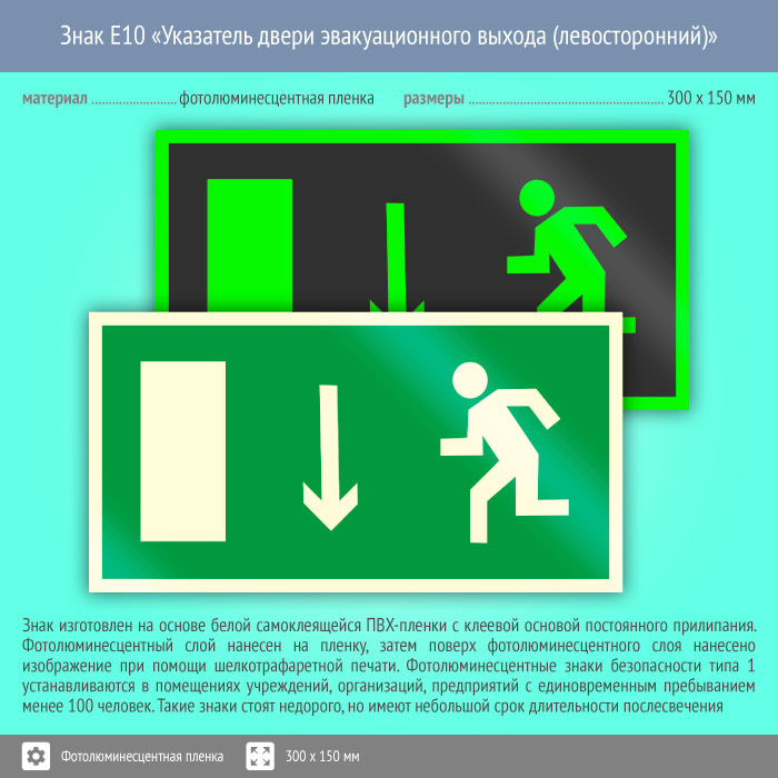 Знак E10 «Указатель двери эвакуационного выхода (левосторонний)» (фотолюминесцентная пленка, 300х150 мм) в Великом Новгороде купить